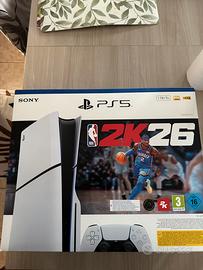 Modello: PS5 Slim (con lettore disco incluso, come indicato dalla dicitura "Disc Drive attached to console"). Memoria: 1 TB di archiviazione SSD. Gioco incluso: NBA 2K26 (fornito come codice voucher digitale, non disco fisico).