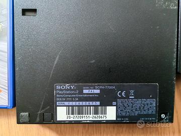 Console PlayStation 2 Slim modello SCPH-77004 di colore nero, completa di controller e cavi.