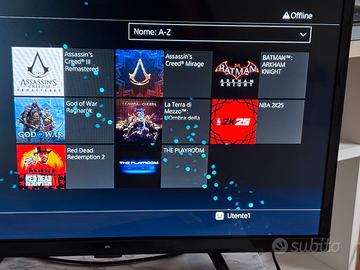 Vendesi PS4 con spazio di memoria da 1 TB, dotata di cavi (alimentazione e hdmi) ed un controller PS4 + Giochi preinstallati in console e funzionanti (AC 3, AC Mirage, Red Dead Redemption 2, La Terra di Mezzo: L'ombra di Mordor; Batman Arkham Knight; NBA 2K25; God of War Ragnarok).