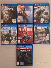 - 7 giochi PS4: Watch Dogs, Watch Dogs 2, Spider-Man, Fallout 4, Battlefield 1, Call of Duty WWII, Uncharted.