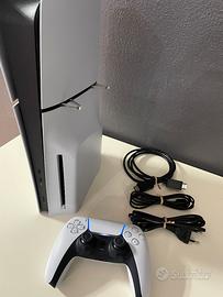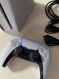 Playstation 5 slim versione disco 1Tb di memoria, ultimo modello prodotto da Sony, completa di controller, tutti i cavi e vertical stand originale. Console nuova e coperta da garanzia.