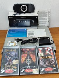 vendo Sony PSP portatile 2004 piano black originale. con tutti i suoi accessori.scatola libretti originali.batteria e caricatori non originale.pero nuovi appena comprati.piu 4 giochi(prince of persia,Medievil Resurrection,il signore degli anelli tactics,kill zone Liberation) più scheda di memoria di 2 GB.