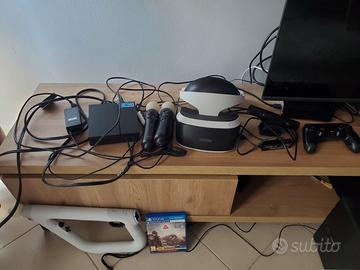 PS VR1 con tutti gli accessori, 2 controller di movimento base carica, telecamera con adattatore per PS5, joystick PS4, Aim controller (quasi inutilizzato), gioco PS4 Farpoint, cavo HDMI.