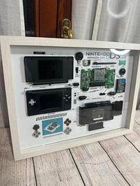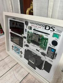 Vendo quadro decorativo con Nintendo DS Lite completamente smontato, con tutti i componenti originali disposti su schema tecnico dettagliato e racchiusi in una cornice elegante color legno chiaro.