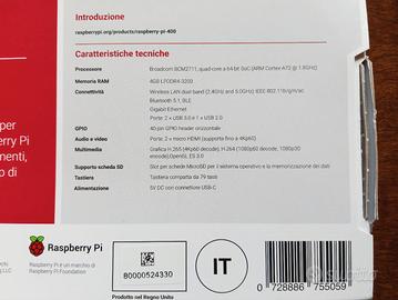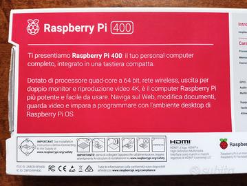 Raspberry Pi 400 personal computer nuovo in confezione originale, aperto solo per testare ed è perfettamente funzionante. Con controller USB compatibile Raspberry, usato in omaggio. No schedina SD e no cavo HDMI-micro HDMI essenziali per il funzionamento.