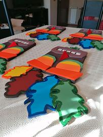 Già intagliate e verniciate. Realizzate completamente a mano, legno di abete chiaro per la tavola base e tavole di MDF per gli altri pezzi.