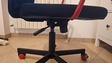 Vendo una sedia da gaming in tessuto traspirante in condizioni pari al nuovo. Ha il sistema idraulico per l'altezza della seduta ed una base composta da 5 ruote. Colore nero con dettagli rossi.