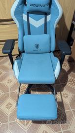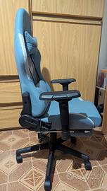 Vendo perchè mi hanno appena regalato l'altra sedia ergonomica... la sedia da gaming è nuovissima, usata solo 1 mese, comoda con un bel colore azzurro e in tessuto, ottimo per l'estate la sedia presenta un massaggio lombare (infatti vedete nella foto che c'è un cavetto per il massaggio), braccioli regolabili a vostro piacimento, poggia piedi allungabile e inclinazione dello schienale a 160° prezzo 90 euro se devo spedire posso smontare tutto e rimettere nello scatolo originale come se fosse nuovo per maggiori informazioni contattatemi in privato!