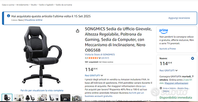 Cedo sedia da gaming nuova acquistata il 15 Settembre a 114 euro su Amazon, come si legge in uno dei due screenshot. Non ha neanche un mese di vita. La poltrona è già quasi tutta montata per dare la possibilità di provarla sedendocisi sopra, mancano soltanto i braccioli. Visionabile a Roseto degli Abruzzi. Prezzo 50 euro intrattabili.