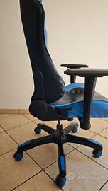 La sedia è di colore blu e nero con dettagli bianchi ed è completa di cuscino poggia-testa e supporto lombare, entrambi rimovibili. Lo schienale è reclinabile e l'altezza è regolabile tramite la leva sottostante.