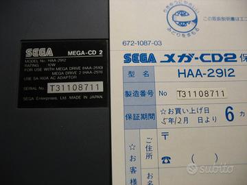 Vendo SEGA MEGA CD 2 console originale Sega, versione jap. Completa di scatola, alimentatore originale Sega jap 110V (necessita convertitore di corrente per il 220V), 2 basi metalliche con 3 viti, estensione in plstica per Megadrive 1, manuale (matching serial number to the unit) e registration card. L'unità è in buone condizioni, scatola in buone-discrete condizioni. Testata, perfettamente funzionante. Per il pagamento accetto tuttosubito o bonifico. Non accetto offerte. Grazie