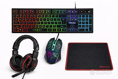 • Set Gaming 4 in 1 completo • Nuovo e ancora imballato • Tastiera USB retroilluminata RGB • Mouse gaming ergonomico con luci LED • Cuffie gaming con microfono integrato • Tappetino mouse incluso • Collegamento Plug & Play USB/Jack • Compatibile con PC, laptop e console