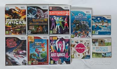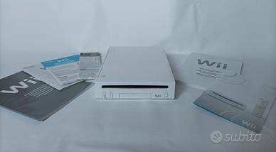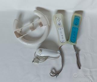 Console di gioco Nintendo Wii, compresi due telecomandi base con custodia, un telecomando nunchuck ed il volante per i giochi di guida. Nel set sono inclusi i seguenti giochi adatti a bambini e ragazzi: