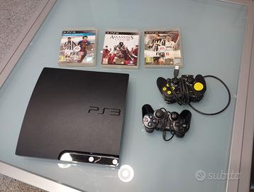 Palystation 3 della Sony, ancora funzionante. Corredata da cavo di alimentazione, due joystick, di cui uno non funziona correttamente. Si includono tre giochi