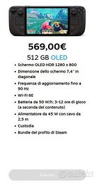 Steam Deck OLED 512GB + Accessori - Pari al nuovo (Introvabile) Vendo bellissima Steam Deck OLED da 512 GB, acquistata a Gennaio direttamente dallo store ufficiale di Steam. La console è letteralmente pari al nuovo, usata pochissimo e tenuta in modo maniacale. Attualmente queste versioni sono quasi introvabili sullo store ufficiale, quindi è un'ottima occasione per averla subito e in condizioni perfette. Vendo esclusivamente per passaggio a PC portatile. Il pacchetto include: * Steam Deck OLED 512GB * Scatola originale * Custodia da viaggio originale Steam * Caricabatterie originale * Pellicola protettiva per lo schermo (già applicata) + 1 pellicola di ricambio * Cover in silicone con pratico stand/poggio integrato Condizioni di vendita: * Prezzo: 500 euro. * Consegna: scambio a mano nelle zone della provincia di Caserta e Napoli. L'annuncio è rivolto a persone realmente interessate che conoscono il reale valore della console e degli accessori. NO perditempo, sognatori o scambi. Disponibile per farla visionare e provare di persona al momento dello scambio. Per qualsiasi informazione o per accordarci per lo scambio, contattatemi tramite la chat di Subito oppure direttamente su WhatsApp. Rispondo in tempi brevi.