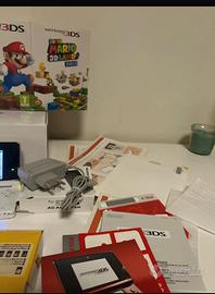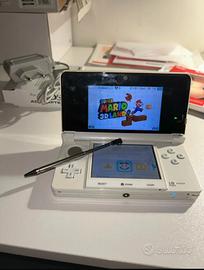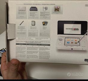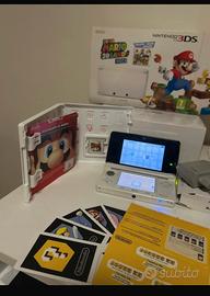 bundle speciale della console portatile Nintendo 3DS in colorazione Bianco Ghiaccio (Ice White), che include il videogioco Super Mario 3D Land. Dettagli del Bundle Console: Nintendo 3DS, successore del DS, dotata di schermi per la visualizzazione 3D stereoscopica senza bisogno di occhiali. Gioco Incluso: Super Mario 3D Land, il primo capitolo della serie Mario progettato specificamente per le capacità 3D della console. Contenuto Extra: In primo piano si nota una bustina gialla contenente le Carte RA (Realtà Aumentata), utilizzabili con le fotocamere della console per visualizzare personaggi e giochi integrati nell'ambiente circostante. prodotto uscito nel 2011, attualmente fuori produzione. caricabatteria ricomprato,nuovo, per il set completo manca la base per il nintendo, ma ricaricabile comunque tramite cavo. tenuto in ottime condizioni