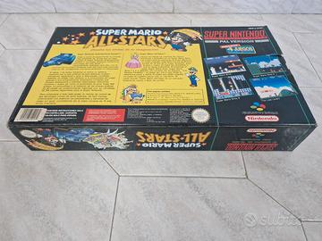 Super Nintendo Super Mario All Stars 1chip Versione Pal GIG. Bellissimo kit completo pari al nuovo testato e funzionante al 100% , scatola originale ancora con tutti colori vividi tenuta in condizioni molto buone all'interno troviamo una console 1chip per giocare al massimo della definizione con 2 controller, un cavo RF ,un alimentatore, un gioco super mario all stars e tutte le garanzie, poster gigante tutto originale e come nuovi per maggiori info e foto contattatemi