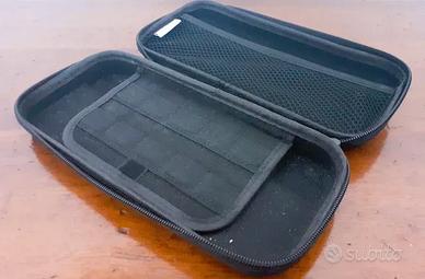 Spupporto HORI per Switch 1 in perfettecondizioni e una custodia nera portatile (la custodia al suo interno ha dei taschini nella parte inferiore per inserire le cartucce dei giochi e nella parte superiore una tasca retinata per i controller)