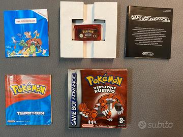 • 🔥 Pokémon Versione Rubino: Scatola metallizzata rossa originale, cartuccia traslucida, manuale Trainer's Guide e tutti i libretti delle precauzioni.