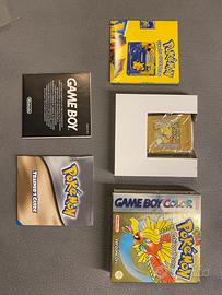 • ☀️ Pokémon Versione Oro: Scatola con l'iconico effetto metallizzato oro, cartuccia color oro glitterata, manuale di istruzioni originale e inserti pubblicitari dell'epoca.