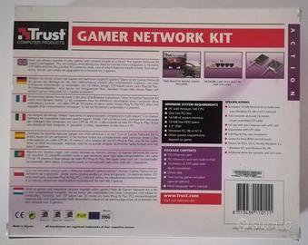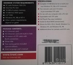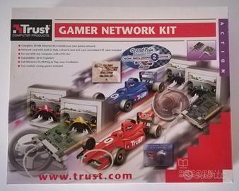 Kit Trust per retrogaming in confezione originale, in ottimo stato. Il kit comprende: 2 schede di rete, cavo di rete da 10 metri, floppy disk con driver per Windows 95/98/NT4, 2 CD con 2 giochi (Grand Prix Racing e Superbike Racing), manuali.