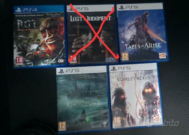 NO SCAMBI Judqment Ps5(Venduto) Code Vein Ps4 20€ Final Fantasv 7 Rebirth Ps5 50€ Cod Modern Warfare 2 Ps5 50€ Dragon Ball Z Kakarot Ps4 20€ The last of Us Remake Ps5 50€ Nier Automata PS4 25€ A.oT. Wings of Freedom (copertina in inglese) Ps4 50€ Lost Judament Ps5 (Venduto) Tales of Arise Ps5 30€ Hoqwarts Legacy Ps5 30€ Scarlet Nexus Ps5 20€ Prezzi trattabili ma niente sconti esagerati