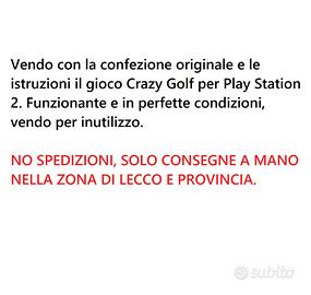 Vendo con la confezione originale e le istruzioni il gioco Crazy Golf per Play Station 2. Funzionante e in perfette condizioni, vendo per inutilizzo. NO SPEDIZIONI, SOLO CONSEGNE A MANO NELLA ZONA DI LECCO E PROVINCIA. Ho a disposizione anche altri giochi, valuto sconti per più giochi acquistati insieme: NINTENDO DS o My Health Coach, Weight Management - 5 euro o Practise English - 5 euro o FIFA 07 - 9 euro o Hanna Montana Musica alle Stelle - 8 euro o Mario vs Donkey Kong, La Marcia dei Minimario - 9 euro o The Simpsons Game - 8 euro PC o The Sims 3 - 9 euro PSP (Play Station Portable) o Formula One 06 - 5 euro o FIFA 08 - 9 euro o Ratchet & Clank, L'altezza non conta - 7 euro o Shrek Terzo - 7 euro PLAY STATION 2 o Crazy Golf - 6 euro o Jak 3 - 6 euro o Peter Pan, La Leggenda dell'Isola che non c'è - 6 euro o PES 3 - 8 euro o PES 4 - 8 euro o Shrek 2 - 6 euro o Tom & Jerry, Guerra all'Ultimo Baffo - 6 euro GAME BOY ADVANCE o Spyro, Season of Ice - 4 euro o La Gang del Bosco - 4 euro