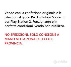 Vendo con la confezione originale e le istruzioni il gioco Pro Evolution Soccer 3 per Play Station 2. Funzionante e in perfette condizioni, vendo per inutilizzo.