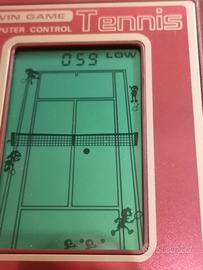 Vendo videogioco vintage anni 80 portatile Tennis sakitron TG-002 prodotto nuovo, fondo di magazzino, con ancora la batteria originale, perfettamente funzionante, completo dell'accessorio cable TG-0022 per 4 giocatori.