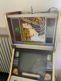 Vendo splendido cabinato videopoker originale anni '90, modello "La Super Milliardaire". Un pezzo autentico di storia delle sale giochi italiane, ideale per collezionisti, amanti del retrogaming o per arredare una "man cave" o un locale in stile vintage. Caratteristiche e Condizioni: Stato: Perfettamente funzionante e pronto all'uso. Monitor: Tubo catodico (CRT) originale con immagini nitide e colori vivaci. Estetica: Mobile in ottime condizioni, grafiche originali e scritte integre come da foto. Meccanica: Pulsantiera reattiva e integra. Rarità: Presenta la targhetta originale di conformità alla legge del 1995. Un oggetto affascinante, conservato con cura, che riporta subito all'atmosfera dei bar di una volta.
