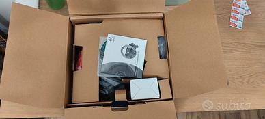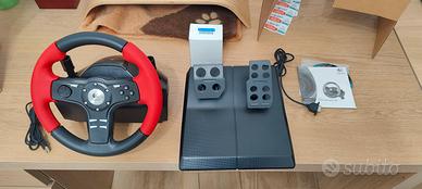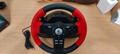Volante della Logitech con force feedback alimentato da apposito alimentatore. Usato solo un paio di volte per mancanza di spazio. Venduto con accessori e in imballaggio e plastiche originali. FUNZIONANTE. Si compone di volante con impugnatura in gomma, pedaliera freno/acceleratore, 12 pulsanti configurabili, tra cui 2 pulsanti cambio posteriori. tastierino direzionale, tutto come da foto.