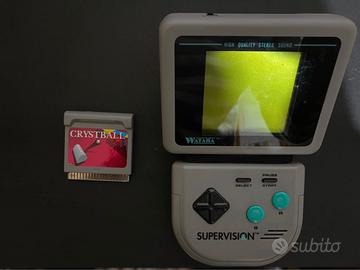 Console portatile handeld Watara SuperVision -perfettamente funzionante, presenta solo leggeri segni superficiali di usura nei bordi -rotelle di regolazione volume e contrasto video -porte alimentazione DC6V, video COMM e headphone jack -giuntura schermo pieghevole con piedini di supporto (foto) -sono incluse 4 batterie AA cariche, già inserite nella console, e la scheda di gioco Crystball compatibile