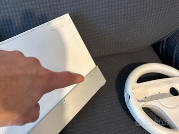 Console Wii 1 telecomando 2 volanti 1 pistola per giochi sparatutto . Alimentatire originale e cavi vari come in foto .