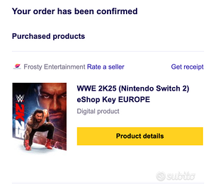 Vendo codice digitale di WWE 2K25 per Nintendo Switch 2 (EU), acquistato per errore su Eneba (pensavo fosse Nintendo Switch normale).