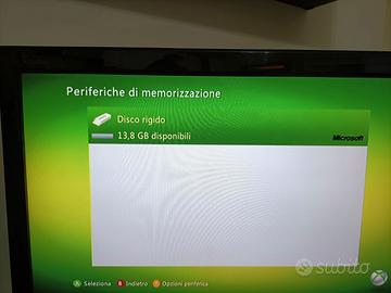 Xbox 360 con alimentatore, cavi in dotazione, joystick wireless, ventola, istruzioni, disco con 13,08 GB disponibili.