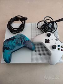 Console Xbox One S DIGITAL usata+ 2 cavi (1 HDMI e 1 per collegare la console alla presa)+ 2 controller: 1 blu con motivo militare in ottime condizioni e 1 classico bianco in buone condizioni + 3 giochi installati: Minecraft, Fornite e Sea of thieves.