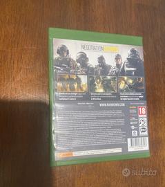 Vendo il videogioco Tom Clancy's Rainbow Six Siege per console Xbox One. Il gioco è un pilastro degli sparatutto tattici in prima persona, focalizzato sulla strategia, la distruttibilità ambientale e la cooperazione tra operatori di diverse unità speciali internazionali.