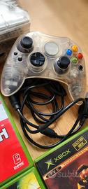 Console in ottime condizioni e perfettamente funzionante, inclusi i cavi. Con due controller e quattro giochi inclusi: Pro Evolution Soccer 4, Starsky&Hutch, Star Wars Jedi Knight Jedi Academy, Halo 2 La plastica dei controller è lievemente ingiallita dal passare del tempo, ma manco troppo. No Scatola