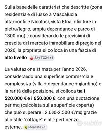 Grande Proprietà composta da 3 unità abitative:1 Villa principale,1 appartamento al primo piano con ingresso autonomo ed 1 seconda villetta di 60 metri quadri circa costruita in stile cottage,1300 m.q. di magico parco con alberi ad alto fusto e vista Etna mozzafiato,lungo viale capiente per una decina di auto,zona residenziale tranquilla abitata e ben servita con bar,gastronomia, tabacchi, rifornimento,fermata bus, farmacia, teatro,sala congressi a pochi metri,area classificata fascia alta/lusso a Mascalucia confine con Nicolosi a soli 15 km da Catania(poco più di 10 minuti in macchina)1.5 km da Nicolosi,20km dall aeroporto e a 25km dalla funivia, proprietà molto bella ed esclusiva unica nel suo genere ideale come abitazione privata di prestigio o da mettere a reddito come struttura ricettiva di charme,B&B,casa vacanze,piccolo camping(c'è abbastanza verde da poter mettere diverse casette prefabbricate),pensione per animali,studio veterinario ecc.ecc.Raro angolo di paradiso difficile da trovare a questa altitudine,vendo a 280000 euro(prezzo già ribassato).Super affare,casa dal valore ben al di sopra del prezzo richiesto che volendo il mutuo se lo paga con l affitto della depandance O affittando tutta la proprietà agli americani di Sigonella a 2000euro al mese(affitto sicuro in quanto pagato direttamente dal governo statunitense).Valuto permuta con casa con giardino in città,appartamento al centro storico,villetta a Mascalucia o paesino limitrofo,casa nobiliare d epoca,appartamento a Malta,auto di prestigio trentennali(possibilmente americane ma non solo),moto Harley,Indian o con ..?Proponete purché siano abitazioni belle,pronte all uso e a prezzo realistico.No perditempo.ps prezzo offerta x questo mese e se senza permuta Per una maggiore visibilità: Villetta villa depandance B&B mansarda casa chalet Catania CT centro storico Gravina appartamento nobiliare d'epoca dammuso mare montagna Mascalucia Pedara Trecastagni Belpasso palmento rustico attico Etna casa vacanze