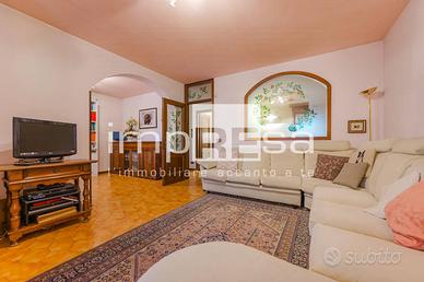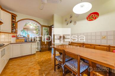 L'immobile si sviluppa su due piani fuori terra piu' interrato. La distribuzione prevede ingresso, cucina separata, soggiorno/pranzo e bagno al piano terra, tre camere letto di cui due con terrazza e bagno al primo piano, garage, cantina, centrale termica e grande taverna con caminetto e cucina defilata al piano interrato. Al piano terra, collegato all'abitazione, è inoltre presente un ampio porticato coperto e chiuso perimetralmente dalle molteplici destinazioni d'uso. Il riscaldamento è autonomo con caldaia a gas metano supportata da pannelli solari in copertura. E' presente la climatizzazione. Le finiture interne sono del periodo di realizzazione ma comunque in ottimo stato di manutenzione. Il giardino di pertinenza si sviluppa su tre lati offrendo privacy e spazi godibili.