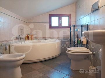 Ad.ze Pitz'e Serra Quartello, villa con ampio giardino. Unifamiliare su 2 livelli cosi composta: P. terra - Ingresso su salone doppio di c. a 45 mq, sala da pranzo, cucina abitabile, 2 ampie camere con possibilità di una terza stanza, ripostiglio, 2 bagni finestrati con doccia e vasca, loggiato frontale. P. 1 - con ingresso indipendente, mansarda di c. a 80 mq con ampio salone, cucina, camera, bagno finestrato e terrazza al piano. Di recente sono stati sostituiti tutti gli infissi in pvc con vetro camera, condizionatori e installati pannelli fotovoltaici da 3 kw. La villa gode di un ampio e curato giardino piantumato, di 2.000 mq c. a con area adibita ad orto e ulivi; ampia disponibilità di parcheggio e locale cantina con annessa tettoia. La villa è ubicata sulla Viale Europa per la quale è in corso un progetto di ampliamento in strada urbana con relativa introduzione di limite di velocità, realizzazione pista ciclabile, aree di verde pubblico e rotonde in sostituzione dei semafori. Ideale anche per due nuclei familiari. Per informazioni e appuntamenti Gabetti Quartu