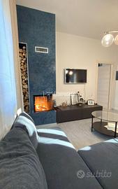 L'ingresso si apre su una zona living luminosa e moderna, dove il fascino del camino a vista si sposa perfettamente con il design attuale e il comfort del grande divano. Gli spazi sono distribuiti in modo impeccabile:
