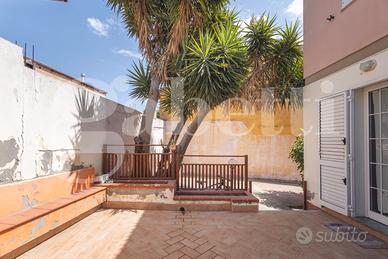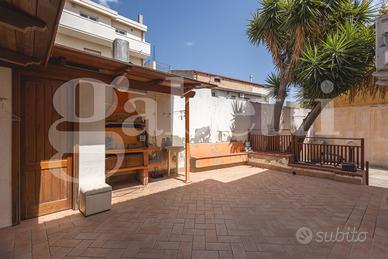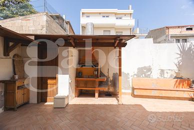 Completa un ampio cortile su tre lati di circa 100 mq con passo carraio e zona barbecue.