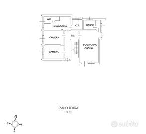 Ingresso su soggiorno con cucina a vista, bagno con box doccia, disimpegno, due camere matrimoniali, lavanderia con secondo bagno e ripostiglio.