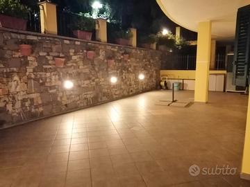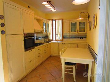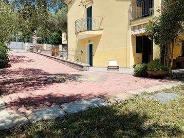 In villa di 6 alloggi, appartamento piano terra di 74 mq, esposizione sud-sud ovest con giardino 100mq, portico di 70mq ,uliveto di 2580 mq(con deposito attrezzi).Doppio bagno,cucina , soggiorno,2 camere. 3 posti auto. Spese condominiali 1200 all'anno. Termoautonomo,Doppio ingresso alla proprietà (di cui 1 con cancello automatico) Distanza dal mare 650mt .NO AGENZIA