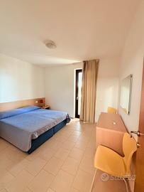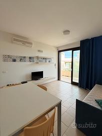 Appartamento al primo piano in Residence con piscina . Composto da : cucina soggiorno , 2 camere da letto , bagno , ripostiglio e veranda con vista. Posto auto . Disponibilità APRILE