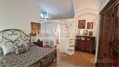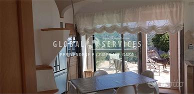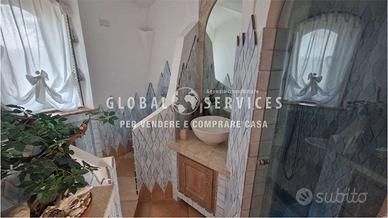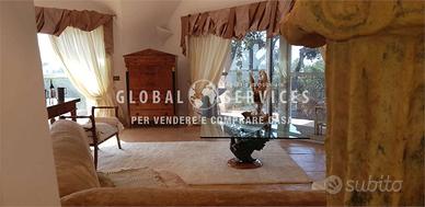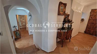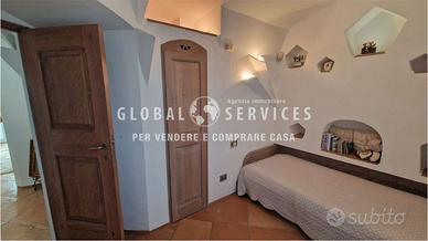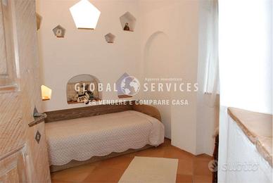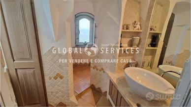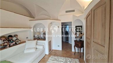 Lingresso principale è costituito da un particolare portone creato da artigiani locali; la composizione interna della casa è così suddivisa: una grande sala con camino, ampie vetrate con serramenti in acciaio, dallo stile più moderno, fatti a mano e personalizzati per la dimora. La cucina in muratura, ampia ed abitabile, ricca di particolari e completamente arredata, è anchessa molto luminosa. Due gradini, creati per movimentare e sottolineare ancora una volta lo stile smeraldino, mettono in comunicazione il disimpegno della zona giorno con alle tre camere da letto di cui una con il proprio bagno padronale. È presente in questa zona, un altro bagno ospiti dalle particolari finiture.