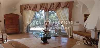 Santa Teresina, in uno dei luoghi più panoramici della Gallura, alle pendici del Monte Moro, a pochi chilometri dal prestigioso centro di Porto Cervo e dal delizioso borgo di San Pantaleo, villa dalla vista spettacolare. Limmobile si trova in posizione unica e panoramica, con vista mare che abbraccia Golfo di Cugnana, Capo Figari, Corsica e arcipelago di La Maddalena . La costruzione dallesterno rispecchia i conosciuti ed antichi stili architettonici del vecchio stazzo gallurese, con granito a vista su tutti i lati della casa, intervallati da finestre e grandi vetrate sulla zona giorno. L'architettura interna della villa, in perfetto stile smeraldino, è ricca di particolari architettonici che ricordano certi stili di ben noti architetti degli anni doro di Porto cervo: nicchie in muratura, piccole scale in pietra per deliziose alcove in mini soppalchi.