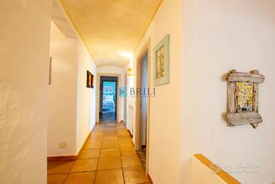 Un grande soggiorno con camino con vista sulle colline di San Pantaleo, cucina abitabile con ulteriore camino, dispensa/lavanderia, un ampio ripostiglio, due bagni, tre camere da letto.