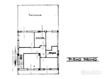 Al piano primo si trova un appartamento di mq. 120 composto da ingresso, ampio soggiorno in marmo rosa e cucina abitabile con accesso da entrambi i locali ad un terrazzo di mq. 77; due camere con parquet con accesso ad un balcone di mq. 11; uno studio con caminetto (originariamente adibito a terza camera); un bagno finestrato.